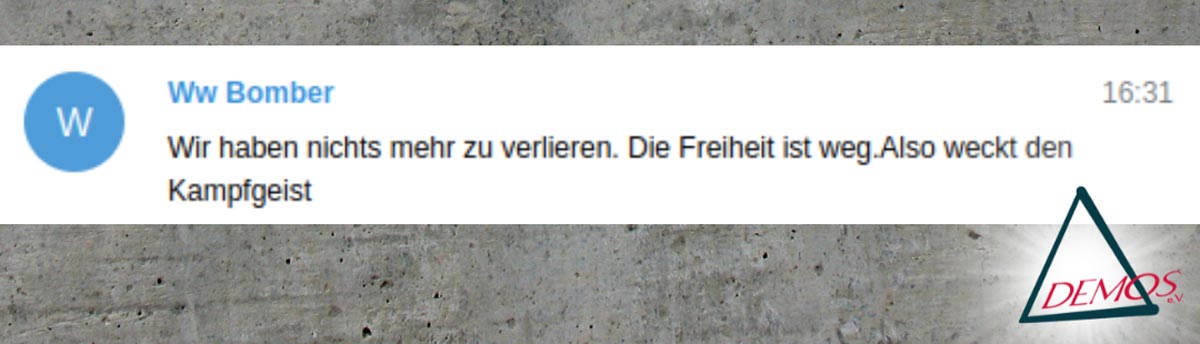 An anderer Stelle distanziert sich ein Mitglied des Gruppenchats offensiv von dem Versuch der Partei „Der III. Weg“, die unangemeldeten Demonstrationen der Gruppe zu unterstützen. Dem widerspricht H. und gibt dabei preis, von der Existenz zweier Parteimitglieder in der Gruppe zu wissen.