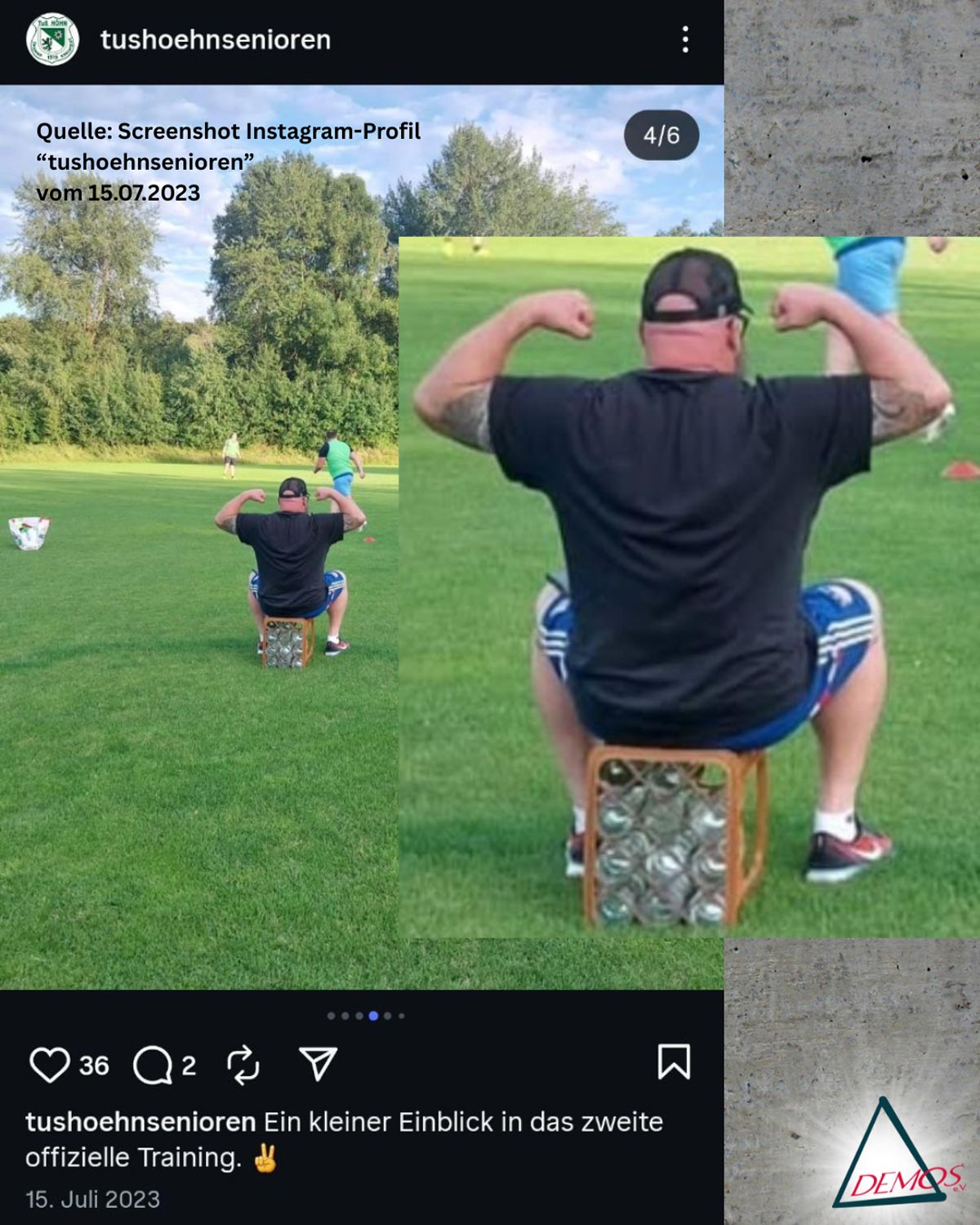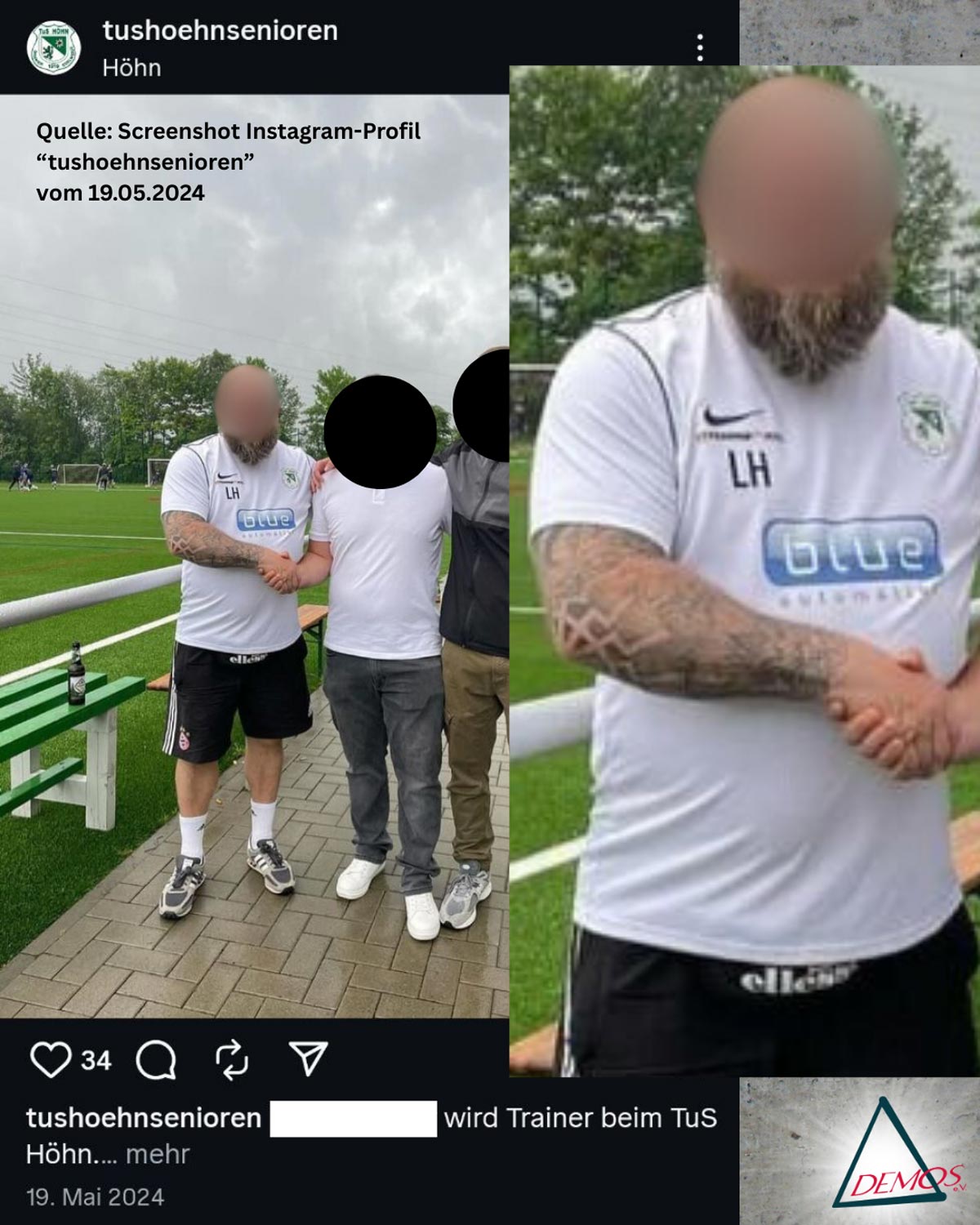 In der Zeit des Nationalsozialismus zierte das zwölfspeichige Sonnenrad den Boden des ehemaligen Obengruppenführersaals der Wewelsburg, der zentralen SS-Ordensburg in der Nähe von Paderborn. In einem Paper des Informations- und Dokumentationszentrums für Antirassismusarbeit e.V. (kurz IDA) wird die „Schwarze Sonne“ daran anknüpfend als „wichtige[s] Symbol der rechtsextremen Szene (…)“ beschrieben. In Anbetracht „des inflationären Gebrauchs des Symbols im gegenwärtigen rechtsextremen Spektrum [bspw. als Tätowierung - Anm. DEMOS e.V.] gehen Beobachter der Szene davon aus, dass die ‚Schwarze Sonne‘ das in Deutschland verbotene Hakenkreuz als typisches ideologisches Erkennungsmerkmal teilweise bereits ersetzt hat“ (siehe "Quellenlink"). Das Tattoo ist eindeutig zwischen 2024 und 2025 entstanden und stellt damit kein Überbleibsel aus seiner Zeit in der Kameradschaft dar. Das lässt sich anhand von zwei Bildern nachweisen, die beide auf einem Instagramkanal des TuS Höhn veröffentlicht wurden.