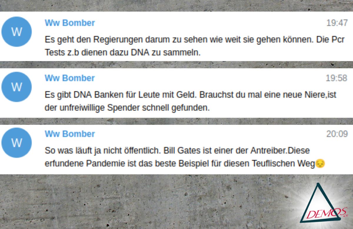 Eine andere Stellungnahme des Accounts behauptet, dass „Pcr Tests“ dazu dienen würden „DNA zu sammeln“, welche genutzt würden um eine Art Datenbank zu speisen, aus der „Leute[n] mit Geld“ bei Bedarf „unfreiwillige“ Organspender auswählen könnten. „Diese erfundene Pandemie“, beteuert er, sei „das beste Beispiel für diesen teuflischen Weg“, den unter anderem Bill Gates vorantreibe.