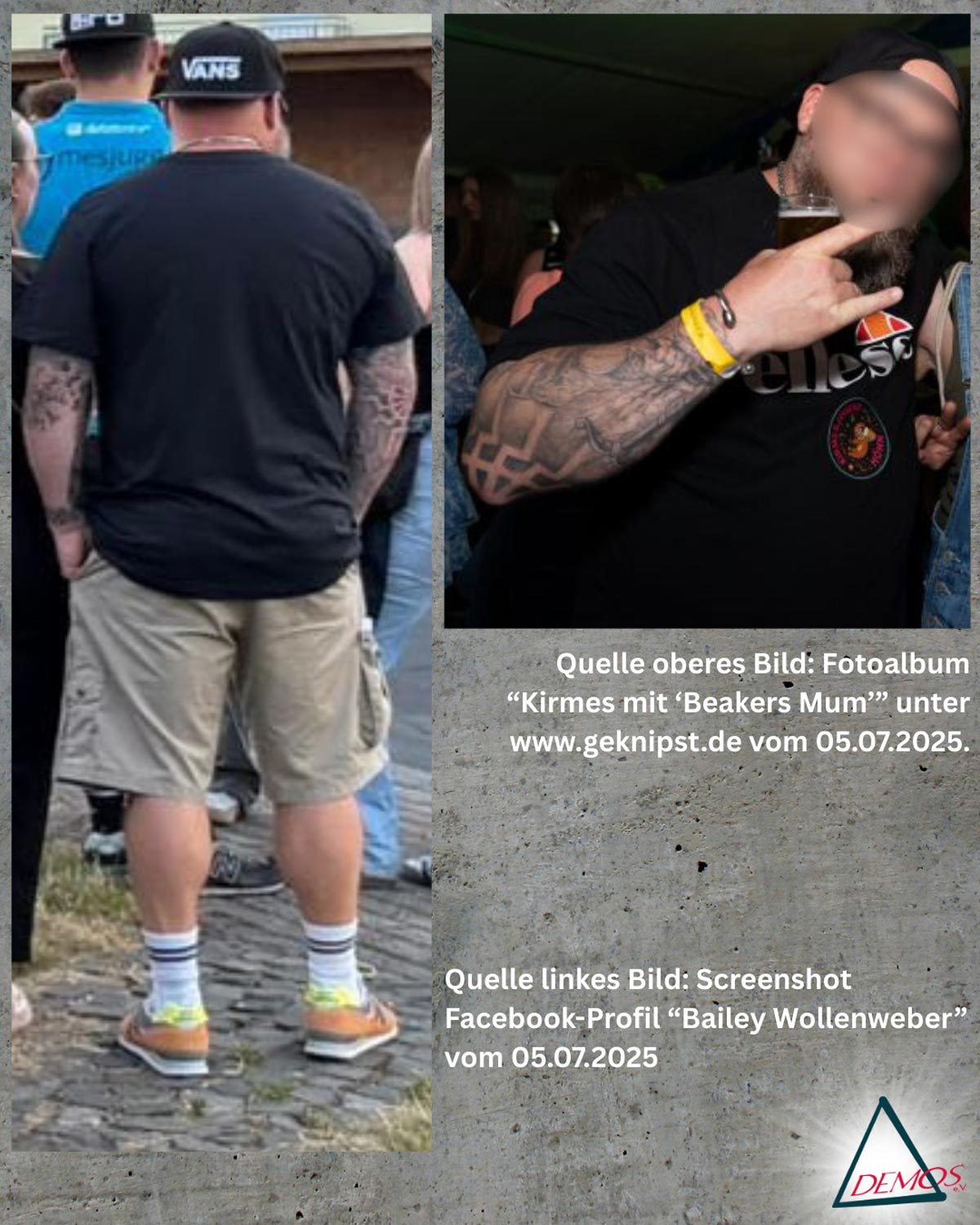 Auf den Fotos, die die AfD zu ihrem Bericht mitliefert, ist nicht nur eine Gruppe anonymisierter Jugendlicher zu erkennen, ebenso fällt eine Person ins Auge, die bei einer Gruppe Jugendlicher steht, aber nur von hinten zu erkennen ist. Auffällig sind die schwarze Snapback, die Brille sowie der Bart; auch die tätowierten Arme des Mannes springen ins Auge. Wer nun die öffentlich zugänglichen Partybilder der Kirmes durchklickt, findet ein Bild vom selben Abend. Darauf zu erkennen: Lars H. mit schwarzer Snapback, Brille, Bart und der selben auffälligen Tätowierung an seinem rechten Ellenbogen.