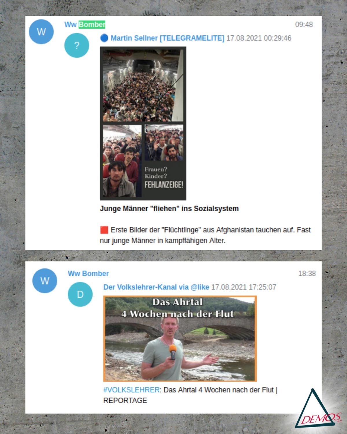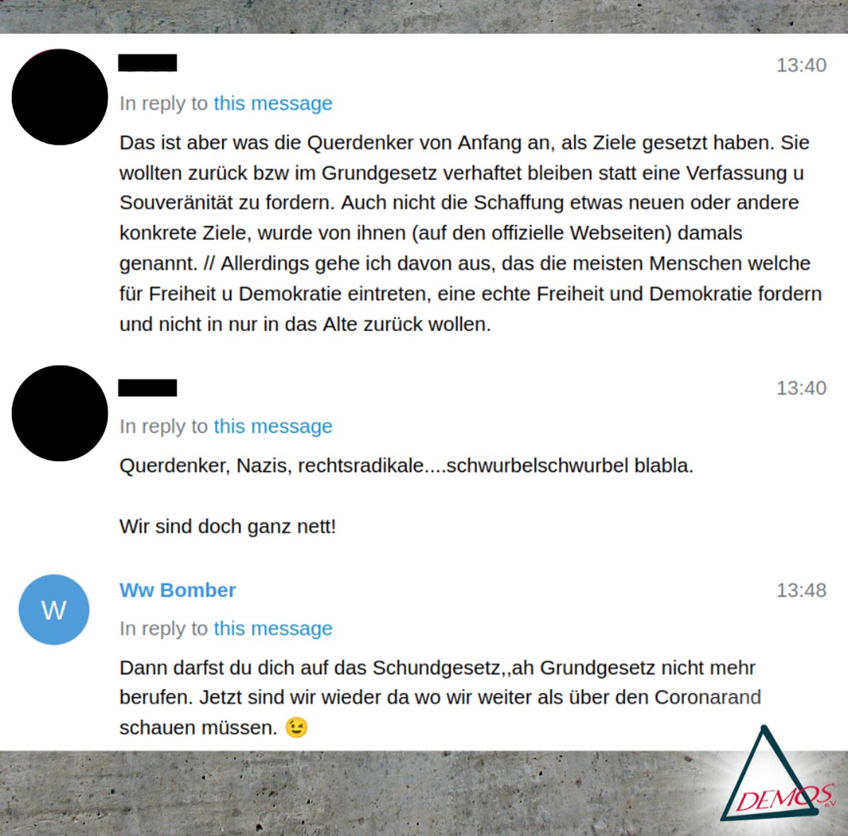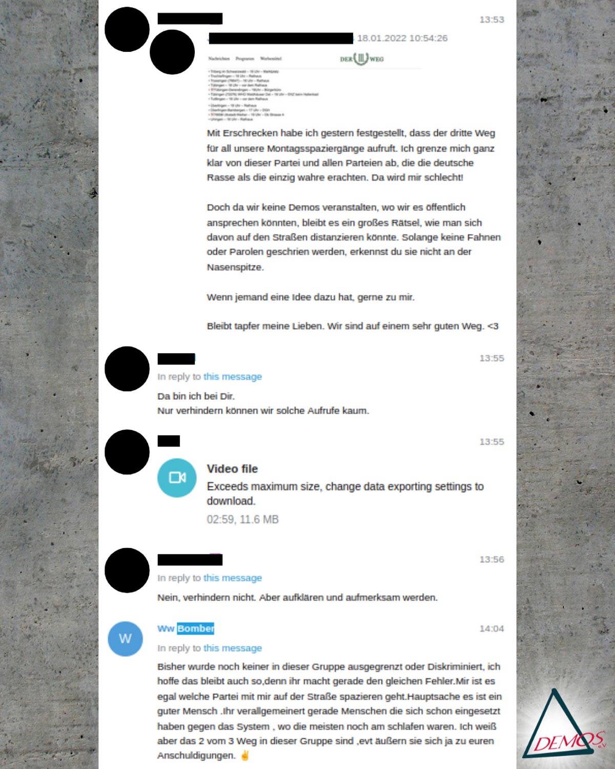 An anderer Stelle distanziert sich ein Mitglied des Gruppenchats offensiv von dem Versuch der Partei „Der III. Weg“, die unangemeldeten Demonstrationen der Gruppe zu unterstützen. Dem widerspricht H. und gibt dabei preis, von der Existenz zweier Parteimitglieder in der Gruppe zu wissen.