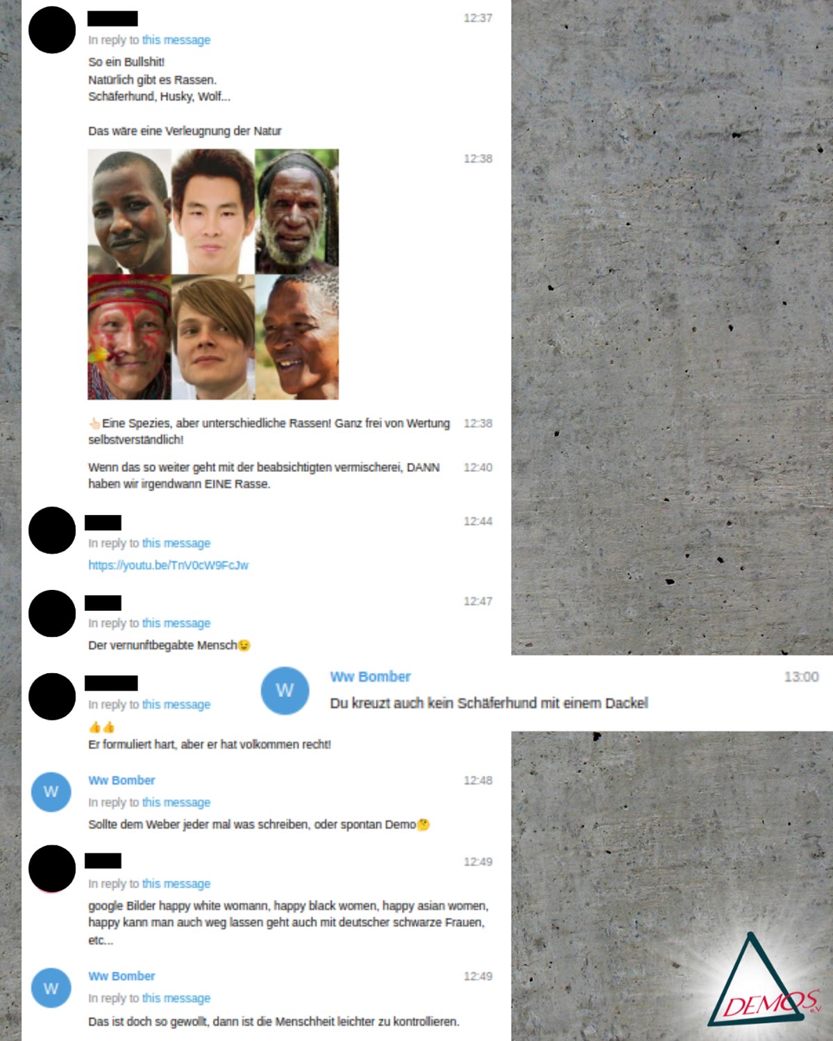 Bis 2022 beteiligt sich das Profil rege an den Diskussionen und offenbart im Zuge dessen Einstellungsmuster, Überzeugungen und Verbindungen. Im Folgenden dokumentieren wir verschiedene dieser Aussagen und ordnen sie ein. In einer Diskussion, die sich mit angeblichen menschlichen Rassen beschäftigt, pflichtet der selbsternannte Ww Bomber dem Wortführer bei, in dem er bekräftigt, dass es eine beabsichtigte „Vermischerei“ von menschlichen Rassen gebe mit dem Ziel, „die Menschheit leichter zu kontrollieren“. Deshalb stellt er fest, dass man die angeblichen menschlichen Rassen ebenso wenig kreuzen dürfe, wie man „auch kein[en] Schäferhund mit einem Dackel [kreuzt]“.