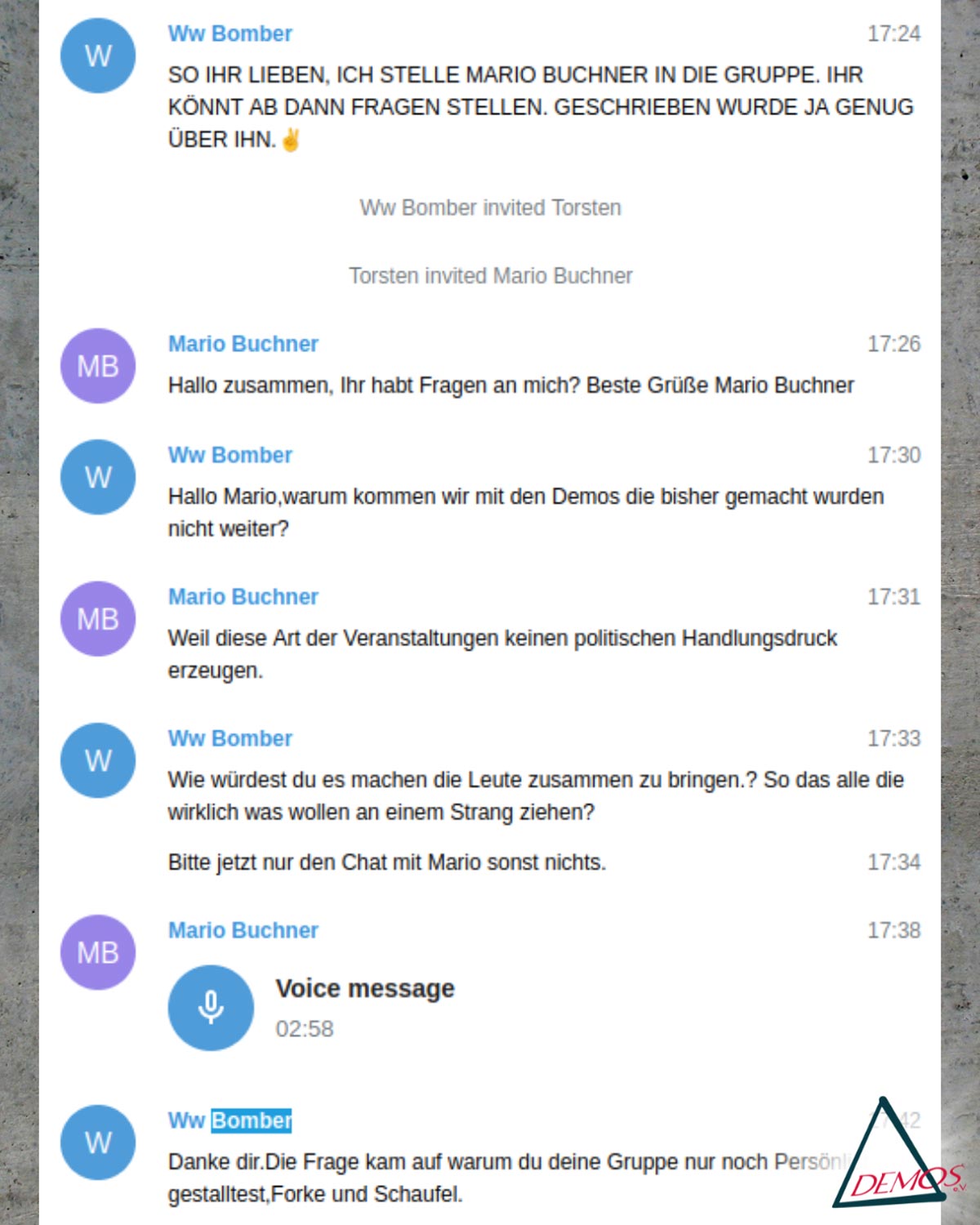 Auch an einer anderen Stelle springt er einem radikalen Akteur zur Seite, von dem sich Teile der Gruppe distanzieren wollen. Zu diesem Zweck lädt er Mario Buchner und Torsten Frank (Anführer der Gruppe „Forke & Schaufel“) in den Chat ein und betätigt sich als eine Art Interviewer und Vermittler.