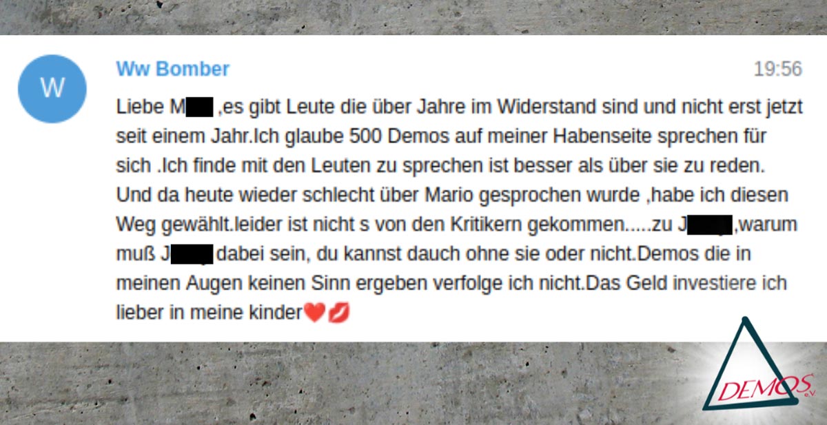 Im Anschluss an eine Diskussion über die Frage, wer bereits was getan hat in der Zeit der Coronapandemie, reagiert H. mit der Aussage, dass er bereits rund „500 Demos auf meiner Habenseite“ wisse und dass es Leute gebe, die bereits „über Jahre im Widerstand sind und nicht erst jetzt seit einem Jahr“.