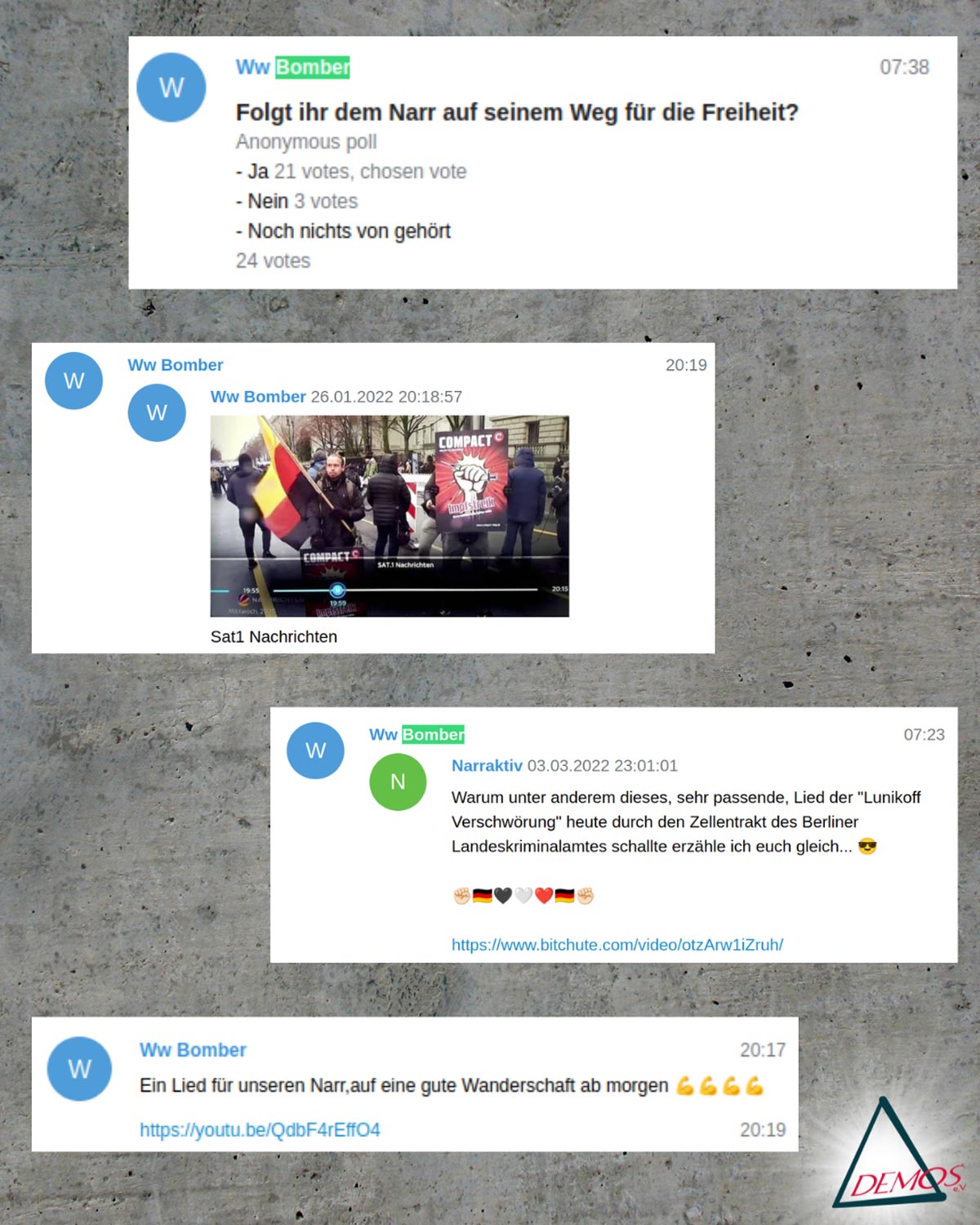 Es scheint uns erhellend einen Blick darauf zu richten, welche Personen Ww Bomber innerhalb der Gruppe teilt und positiv hervorhebt. Dazu zählen einschlägige Kanäle wie der von Martin Sellner, Der Volkslehrer und – ganz besonders – „der narr“ oder auch „Narraktiv“. Dessen Beiträge teilt der Ww Bomber immer wieder und ruft dazu auf den narr auf seiner Reise nach Berlin zu unterstützen (dort wolle der narr bleiben bis die Regierung gestürzt wurde). Diese Verbindung ist besonders spannend, denn bei dem selbsternannten „der narr“ handelte es sich um das ehemalige NPD-Kreistagsmitglied Christian Greeb. Dieser und Lars H. kennen sich bereits aus der Zeit der Kameradschaft Westerwald.
